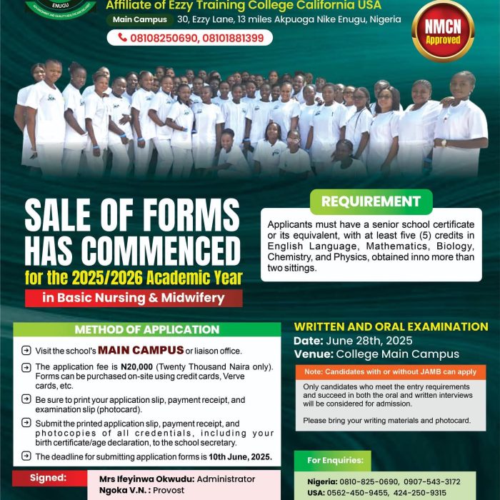 Interested candidates can apply online through our website or visit our admissions office at the main campus in Akpuoga Nike, Enugu, Nigeria, or our liaison office at Ezzycares multi-specialist hospital, located at No. 1 Umunze Crescent opposite the EEDC office, phase-six Trans-Ekulu, Enugu.